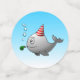 Cute illustration of a little whale on table confetti. The whale is wearing a red and white striped party hat and has started the birthday party.
