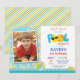 Pool Party Birthday Invitation with custom photo. Summer Splish Splash. Boy Birthday Party Invite. Beach Ball. Swimming. Swimsuit. Birthday Bash. Blue Red Yellow Orange Green Stripes. White Background. 1st First Birthday. 1st 2nd 3rd 4th 5th 6th 7th 8th 9th 10th 11th 12th 13th 14th 15th, Any Age. Printable Digital. For further customization, please click the "Customize it" button and use our design tool to modify this template.