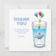 Thank You Card with a cute illustration of a little whale. The whale is wearing a red and white striped party hat and has started the birthday party which takes place in a filled water glass.