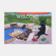 Pool Party Labradors 2 Painting Doormat. Whimsy and funny Labrador Retriever Painting postcard. Labrador Painting painted by Naomi Ochiai. Black Labrador, Chocolate Labrador, Yellow Labrador are all painted in the picture. Happy Pool Party! Black Lab is checking his/her emails via Paw Pad. Chocolate Lab is having hamburgers! Yellow Lab enjoys floating on the water meanwhile other three Labrador dogs are having fun.