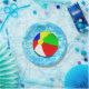 Summer swimming party design, featuring a beach ball in a cool pool. Add text to personalize.