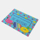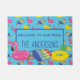 Welcome guests to your pool or home with this fun door mat featuring a pattern of brightly colored pool floats or pool tubes in the shape of a flamingo, a pineapple and a popsicle against a bright blue background. Use the template field to easily add your name to this pool party themed doormat.