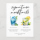 This chic poolside signature mocktails menu features simple script above 2 beach wedding or pool party drinks and their ingredients for your coastal celebration. A cute Blue Lagoon drink and Mint Julep drawing for a refreshing summer reception. Complete with the couple's names and date.