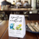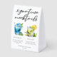 This chic poolside signature mocktails paper table tent sign features simple script above 2 beach wedding or pool party drinks and their ingredients for your coastal celebration. A cute Blue Lagoon drink and Mint Julep drawing for a refreshing summer reception. Complete with the couple's names and date.