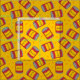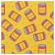 Fun yellow fabric patterned with popart style red cans of baked beans