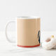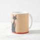 A black and red cartoon cat, in a mid-century modern style, siting on a red shelf or floor, against a peachy background, creates a charming mug. Perfect for anyone who loves cats.