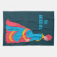 This personalized kitchen towel features an illustration of a 19th century woman wearing a bustle dress in bright pop art colors of bright blue, hot pink and yellow set against a navy blue background. The towel is ready to be personalized with a name or other text in bright blue lettering.