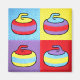 A playful celebration of color, texture, and repetition, this design presents a quartet of stylized curling stones rendered in a bold, painterly pop-art style. Each stone sits within its own vibrant color field, swapping hues and combinations to create a rhythmic visual variation that feels both cohesive and dynamic. The thick, hand-drawn outlines and visible brush-like textures give the forms a tactile, almost folk-art warmth, while the simplified shapes and high-contrast palette lend a modern, graphic punch. The result is a lively, whimsical composition that captures the spirit of curling through a lens of cheerful abstraction and expressive color.