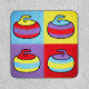 A playful celebration of color, texture, and repetition, this design presents a quartet of stylized curling stones rendered in a bold, painterly pop-art style. Each stone sits within its own vibrant color field, swapping hues and combinations to create a rhythmic visual variation that feels both cohesive and dynamic. The thick, hand-drawn outlines and visible brush-like textures give the forms a tactile, almost folk-art warmth, while the simplified shapes and high-contrast palette lend a modern, graphic punch. The result is a lively, whimsical composition that captures the spirit of curling through a lens of cheerful abstraction and expressive color.