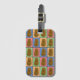 Fun colourful pop art style luggage tag with a pattern of different coloured rectangles each with a happy brown potato in the middle.