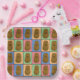 Fun colourful pop art style paper plates with a pattern of different coloured rectangles each with a happy brown potato in the middle.