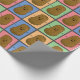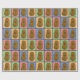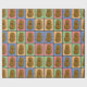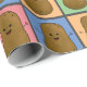 Fun colourful pop art style wrapping paper with a pattern of different coloured rectangles each with a happy brown potato in the middle.