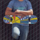 Pop art sunburst, abstract bright cosmic rays skateboard