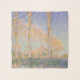 impressionist landscape painting depicting three poplar trees on the Banks of the Epte River near Giverny, Eure, Normandy, France, in fall, ln the light of a late afternoon sunset. Thee deep blue sky contrasts with the warm pink orange and yellow leaves, the foliage is reflected in the waters of the river