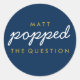 Popped the Question Popcorn Welcome Bag Sticker in Navy Blue, Gold and White. Adhere this sticker to a bag of freshly popped popcorn, ring pop or other fun wedding themed snack