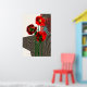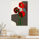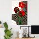 Mod poppy design in bold reds and black. Patterns on patterns to create floral shapes. Geometric angles define three poppies in a vase.