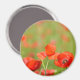 Round photo magnet with vibrant red poppy flowers in a green field full of poppies. It has a strong emotion of hapiness, spring and summer.