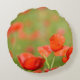 Round throw pillow with vibrant red poppy flowers in a green field full of poppies. It has a strong emotion of hapiness, spring and summer.