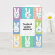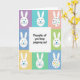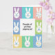 Designed with a tidy grid of soft spring colors, this card frames a central white square like a little window into a sweet note 🌷. Eight pastel panels in lavender, sky blue, peach, mint, and sunny yellow surround the middle, creating a gentle, friendly setting. In the center, the message “Thoughts of you keep popping up!” sits neatly in rounded black lettering, balanced and easy to read. Around it, simple white bunny figures 🐰 appear in the outer squares, each with a round head, long ears, tiny black dot eyes, subtle whiskers, and a bright blue triangular nose. Their calm faces and forward-facing poses feel like quiet check-ins from a friend, as if they’re leaning in with soft attention. On the right side, two bunnies stand out with bodies covered in scattered polka dots in reds, pinks, purples, yellows, greens, and blues, adding a festive touch against the pastel backgrounds. The composition stays centered and symmetrical, with the crisp white middle square contrasting clearly against the surrounding colored panels.