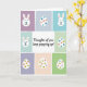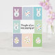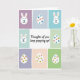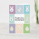 This design shows a tidy nine-panel grid, with soft pastel squares arranged around a white rectangle in the middle. In that center space, a dark, flowing line of text reads, “Thoughts of you keep popping up!”, standing out clearly against the blank background. The surrounding eight panels alternate between a simple white bunny face with tall ears and a long white egg shape, creating a sweet back-and-forth like two friends trading little notes 🐰. The bunny face is minimal, with dot eyes, a bright blue nose, and a small curved smile that feels like a gentle, shy glance. The egg shapes are sprinkled with round polka dots in calm blues, warm oranges, mellow greens, soft purples, and tiny touches of yellow-gold, like confetti drifting across a spring table 🌷. Each panel sits on its own pastel backdrop—lavender, light sky blue, mint, pale peach, and muted sage—with a faint texture that keeps the colors from looking flat. The final row includes a lavender square with the white bunny face beside a mint square filled with the dotted white egg.