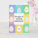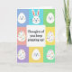 This greeting card features a neat nine-panel grid with a white center panel that reads “Thoughts of you keep popping up!” in a dark, serif-style font. Around it, eight egg-shaped illustrations sit on soft pastel backgrounds in light blue, mint green, sunny yellow, peach, and lavender. Several eggs show simple animal faces with tiny black eyes, a small blue nose, and fine whisker lines, as if they’re sharing a shy, affectionate glance across the grid 🐰. One panel highlights a white long-eared bunny face with pale pink inside the ears, giving the layout a gentle, friendly tone 🐇. Other eggs are covered in scattered polka dots in pink, blue, green, yellow, orange, and purple, adding a festive touch without feeling busy. The message is centered and framed by the surrounding panels, so your eye keeps returning to the words while the characters quietly “keep showing up” around them. Each outer panel has crisp, flat shapes with smooth edges, and the dotted eggs sit evenly spaced against their pastel squares.