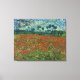 Poppy Field by Vincent Van Gogh, oil on canvas 1890, is a landscape painting of vast fields of brilliant red poppy flowers stretching to the distant tree lines and rolling hills. Busy, swirling, thickly and vigorously applied brush strokes of contrasting and complementary colors lead the viewer’s eye ceaselessly around the composition, giving a feeling of both appreciation of natural beauty and great disturbance. Points of purple-violet and other colors define other flowers in the foreground as well as the rounded tree tops that intersect the swirling sky at the edges of the field.