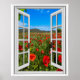 Bright Red poppies in a field, fake window scene, for a windowless room or office wall. Fun, realistic optical illusion scenic poster for an office or study wall.