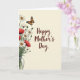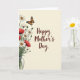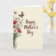 Designed with a calm spring look, the card shows a clear glass vase on the left holding a full bouquet of white daisies with sunny yellow centers beside deep red poppies with soft, velvety petals. The flowers lean gently toward each other, like close friends sharing the same space, and the mix of light and dark blooms creates a tender, romantic contrast ❤️. Above the bouquet, a single butterfly with orange-and-black patterned wings hovers as if pausing mid-dance. The background stays light and airy, letting the natural shapes and soft watercolor shading stand out without feeling busy. On the right side, the words “Happy Mother’s Day” sit centered and slightly above mid-height in flowing deep maroon lettering. The text is spaced with plenty of breathing room, balancing the weight of the bouquet on the opposite side. Fine line details trace the petals, stems, and vase rim, with a few pale green leaves tucked between the blooms 🌼.