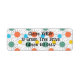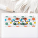 These return address labels have a mid-century modern design of circles with lines behind in orange, yellow, turquoise, and green.