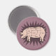 Pork cuts chart with descriptions by the gourmand. Happy cartoon-ish pig on a burst background, with dotted line sections. T-shirts, sweats, mugs, bags, gifts.