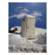 A modern portable outhouse sits frozen in a snow drift on a bright winter day, waiting to serve.