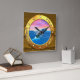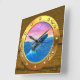 Inside a wooden sailing ship at sea a golden porthole reveals a mystery. A humpback whale breaches into view against a bolden sunset like a dream come true.
