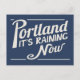 Parody commentary on Portland Oregon's tourism promotion with, "Portland Is Raining Now" in fancy lettering. T-shirts, sweats, cards, stickers, novelty gift swag.