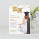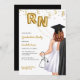 Portrait Nursing School Graduation Party Invitation. Curvy female Nurse Invitation for your daughter, niece, mother, aunt, cousin, or friend who is graduating from nursing school and is now officially a nurse. Women Nursing School Graduation Invitation for grad parties celebrating women who just graduated from nursing school. Celebrate the new Registered Nurse with this elegant nursing graduation invitation! Featuring portrait of a light skin, plus size woman wavy brown-red hair. The nurse grad is wearing a stylish white dress, a black graduation robe draped over her shoulder, and a matching black graduation cap. She holds gold foil style balloons with the letters RN in one hand and a stethoscope in the other hand. Accented with shimmering gold confetti, it perfectly captures the joy and excitement of her big achievement.
