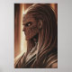 A scary alien with long blond hair, yellow eyes, and wooden skin. This is a AI generated art.
