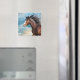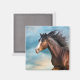 This product features a close up view of a beautiful brown horse with long mane set against blue background.