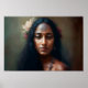 Portrait painting of an Indian woman's face with a lotus flower in her hair and a henna design on her forehead.