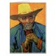 Portrait of Patience Escalier by Vincent van Gogh is a vintage fine art post impressionism daily life portrait painting featuring an old man, a local peasant farmer with a beard with his hands clasped before him and wearing a yellow straw hat.