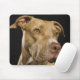 Portrait of red nose pitbull with black mouse pad