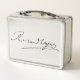 This is a standard metal lunchbox that appears to work just fine. We designed this box ourselves with an uploaded photo and custom text on the front and back. It looks absolutely beautiful except the front of the lunchbox is not centered like it shows in the photo. The print borders don't align with the inset flat part of the box where the preview photo online showed it perfectly centered in there. The back looks nice and centered though.