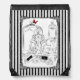 A ladies dressing room framed by a vintage style ornate frame with distressed black striped background.
