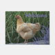 This door mat features a buff orpington hen posing on a bloulder near some pretty purple russian sage.