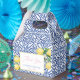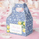 Stylish favor boxes with a vintage Blue White tile pattern, handpainted watercolor lemons and calligraphy font.