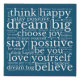 A modern typographical design of positive words to display in your home with this WordArt pattern in white with the encouraging quotes, Believe, Choose joy, Think Happy, Dream Big, Stay Positive, Love Yourself and Be You, on a turquoise background.