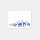 Post-it-Notes shown with fancy blue deer or elk wandering across the paper near the bottom. These deer have a blue tone on tone landscape across their bodies. On white background.