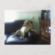 the dog sitting on a leather sofa looking like she really owns the place, looking like a human!