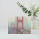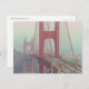 The image shows a partial view of the Golden Gate Bridge in San Francisco, shrouded in fog. The bridge's distinctive red-orange color is visible, contrasting with the gray fog. Cars are seen driving on the bridge. The background features blurred hills and sky due to the fog. The overall mood is atmospheric and slightly mysterious.