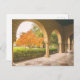 The image captures a view through a series of arched doorways, revealing a tranquil courtyard scene at Stanford University, California. The arches are constructed of warm, textured stone, creating a sense of age and grandeur. A vibrant orange maple tree stands out against the backdrop of lush green foliage, adding a splash of color to the autumnal landscape.
