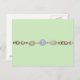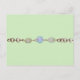 Pale yellow-green beads flank a blue bead with painted flower, on a copper chain. Background in pale green.