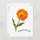 Orange flower with rain drops on petals, green stem and leaves. Curved text at bottom reads "Calendula"